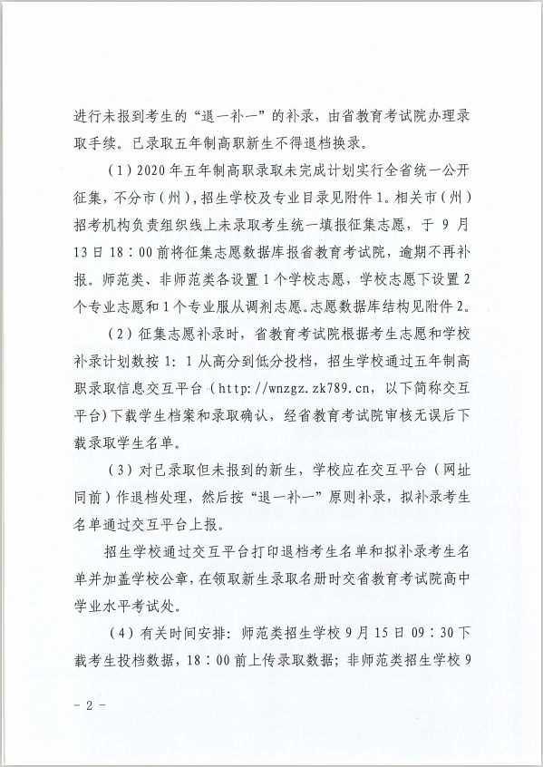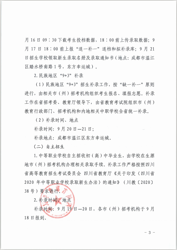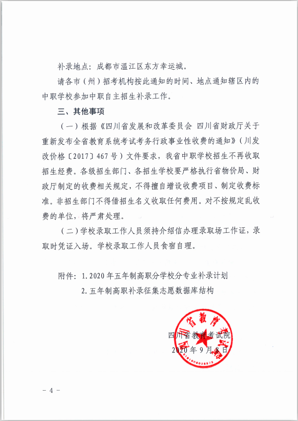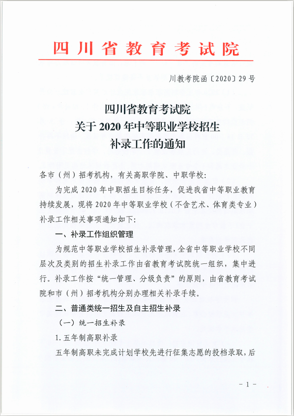 2020年5123五湖四取四海红一世 关于护理专业五年一贯制(3+2)教育补录征集志愿的通知 发布时间: 2020-09-10 2020年5123五湖四取四海红一世 关于护理专业五年一贯制(3+2)教育补录征集志愿的通知 护理专业五年一贯制(3+2)教育补录工作已经开始! 请有意向就读我校护理专业五年一贯制(3+2)教育并且中考成绩达到今年投档线的中考应届毕业生的家长注意了! 请于即日起关注各地、市、州招办通知,完善补录志愿填报。 一、2020年五年制高职招生专业计划一览表 二、附:四川省教育考试院关于2020年招生补录的通知(文件附件因版面原因省略)